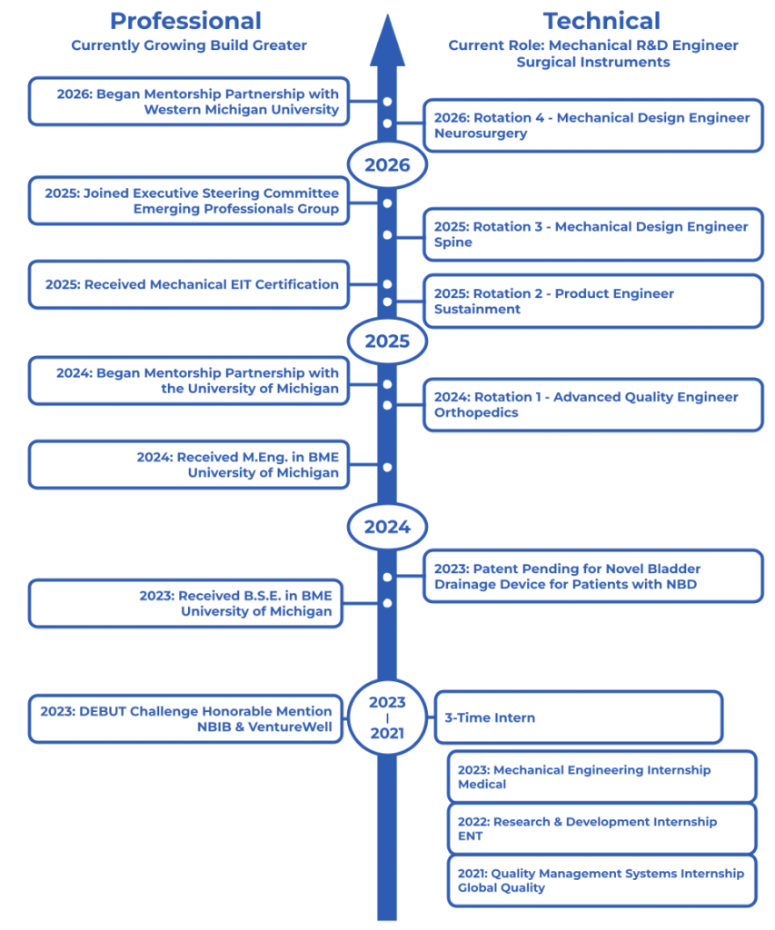 Thanks to multiple internships and my current role as a rotational Mechanical Design Engineer, I have experience in R&D, Quality, Design, Manufacturing, and Post Market Sustainment Engineering roles. Through my projects in these technical roles and extracurricular work on multiple professional development boards and organizations, culture teams, and interview panels, I have a wide variety of experiences and a growing knowledge of what it takes to become a great engineer.